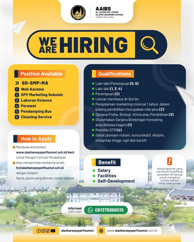 Al-Azhar Asy-Syarif Islamic Boarding School (AAIBS) membuka kesempatan berkarier bagi putra-putri terbaik bangsa untuk bergabung dalam keluarga besar kami. Sebagai sekolah Islam modern dengan sistem boarding, AAIBS berkomitmen mencetak Generasi Muslim Intelektual yang berilmu, berakhlak, dan siap bersaing di tingkat global.
